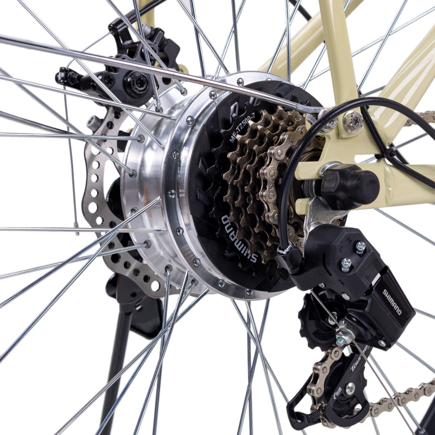 - Gears: Shimano 7-speed drivetrain for versatile riding on varied terrain.